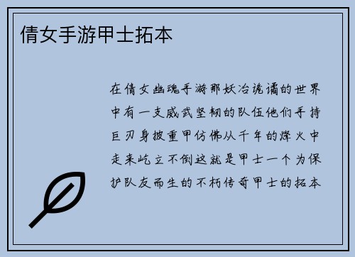 倩女幽魂手游:甲士拓本,不朽传奇,尽在其中。如果您渴望体验无畏的战斗,成为守护世界的坚盾,那么甲士拓本便是您的不二之选。踏上征程,书写属于您的传奇篇章吧!