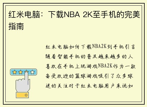 随着智能手机的普及,越来越多的人喜欢在手机上玩游戏。NBA 2K作为一款备受欢迎的篮球游戏,吸引了众多球迷的关注。对于红米电脑用户来说,如何将NBA 2K下载到手机上成为了一个热门话题。本文将详细介绍红米电脑下载NBA 2K到手机的方法,帮助用户实现在手机上畅快体验篮球游戏的愿望。